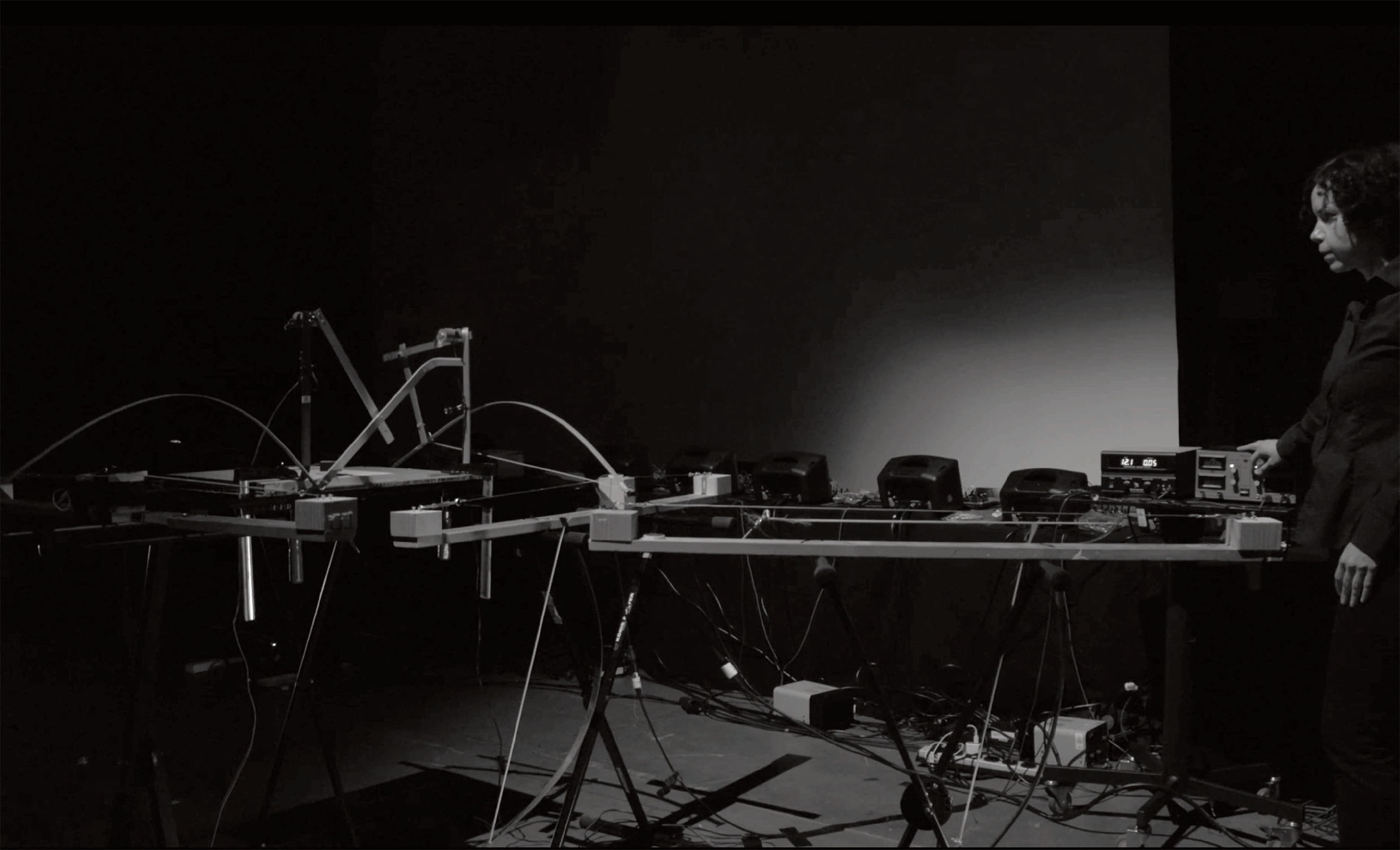 The piece begins with giving continuous inputs to an electric orchestra. As the score begins to play, the sound of the cellos starts to occupy the physical space with their immediate presence. New behaviors begin to emerge, and the robotic instrument slowly creeps towards its operating limits with an ever-shorter series of signals. Gravity and (im)balance are becoming visible and audible. By choosing a fragile self-made robotic instrument we use sound and movement to explore the implications of an uncertain physical presence: as the rhythmic density and diversity of the cellos continues to increase, the overlapping and mutually interfering inputs to the robot’s engine lead to a chain reaction that escalates into a chaotic dance of the machines creating their own sound world.